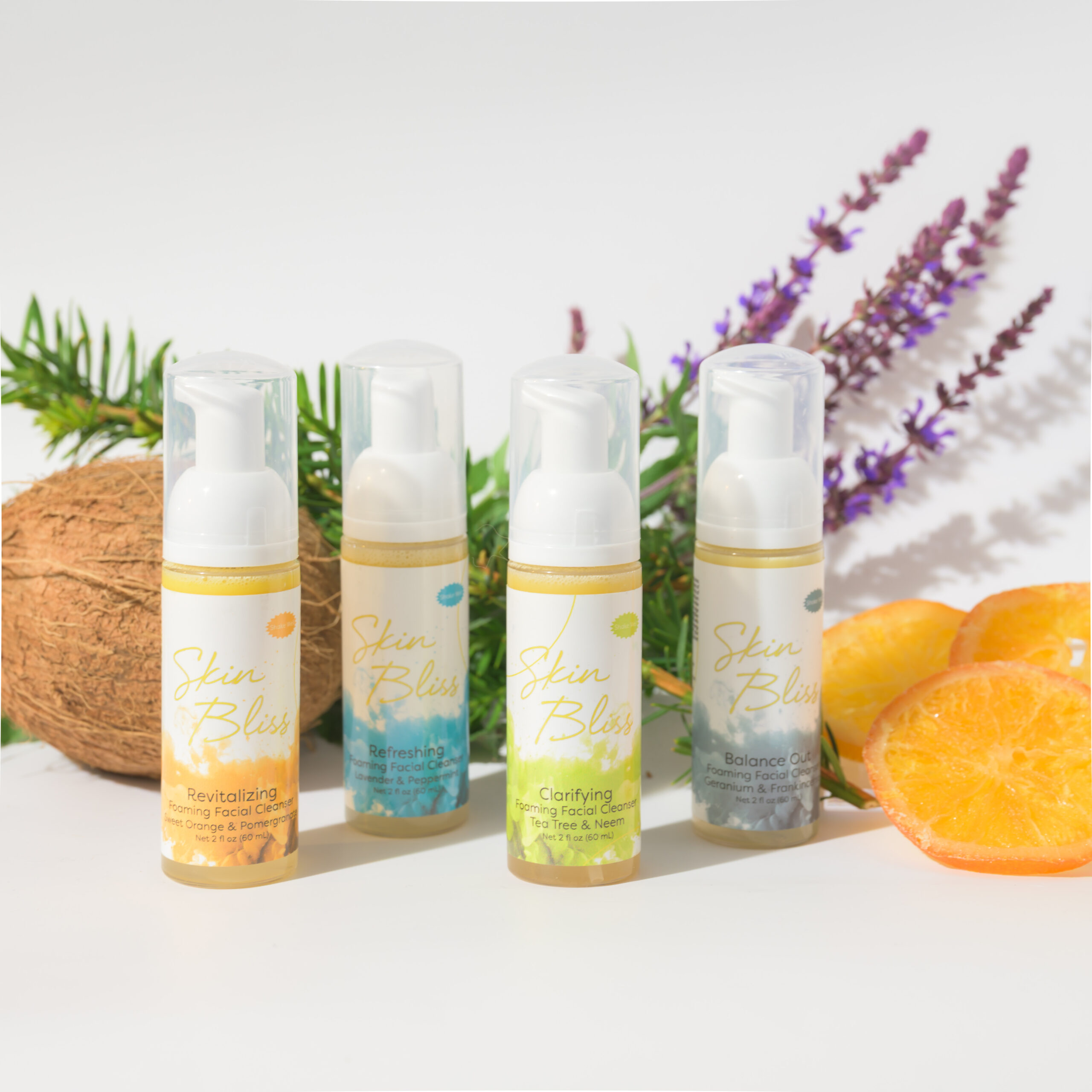 - Product Description: Skin Bliss Foaming Facial Cleansers: Our collection of all-natural foaming facial cleansers is designed to cleanse, balance, and nourish the skin gently yet effectively. Each variant is infused with unique botanical extracts and essential oils that target specific skin concerns—whether you’re looking for deep cleansing, acne control, brightening, anti-aging, soothing, or refreshing benefits. Formulated for all skin types, including sensitive and mature skin, these cleansers remove impurities while keeping the skin hydrated, calm, and radiant.